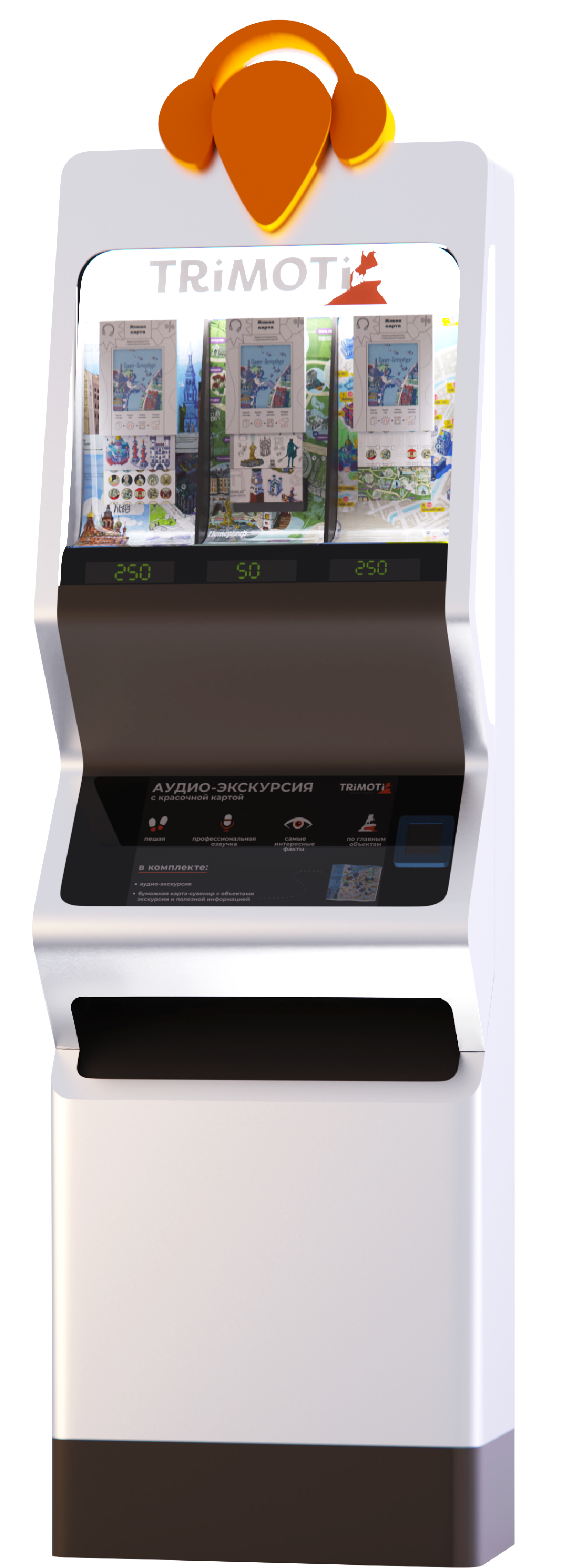 Автомат позволяет продавать 3 вида наборов с разными картами и аудиоэкскурсиями, чтобы пользователь мог выбрать наиболее подходящую для него услугу.