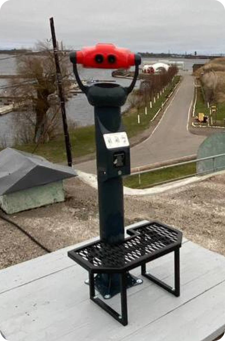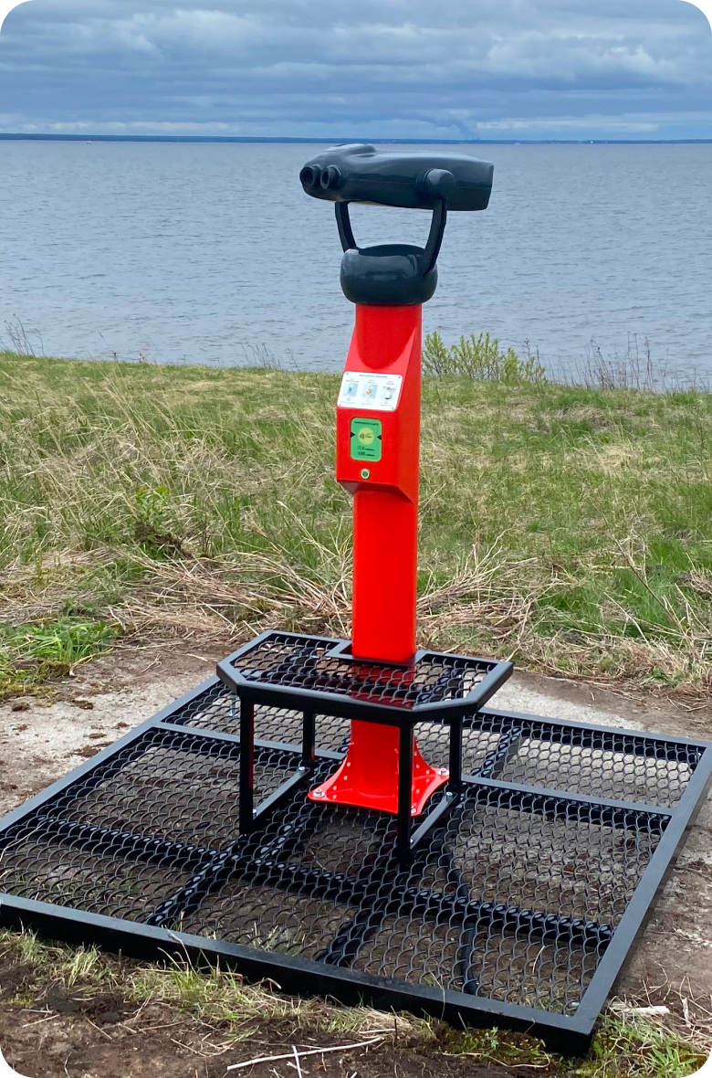 Антивандальный смотровой блок бинокля выполнен из литого антикоррозийного алюминиевого сплава с эргономичными наглазниками. Блок обеспечивает увеличение в диапазоне 8−12 крат. Для юных наблюдателей предусмотрена детская подставка с антискользящей накладкой.